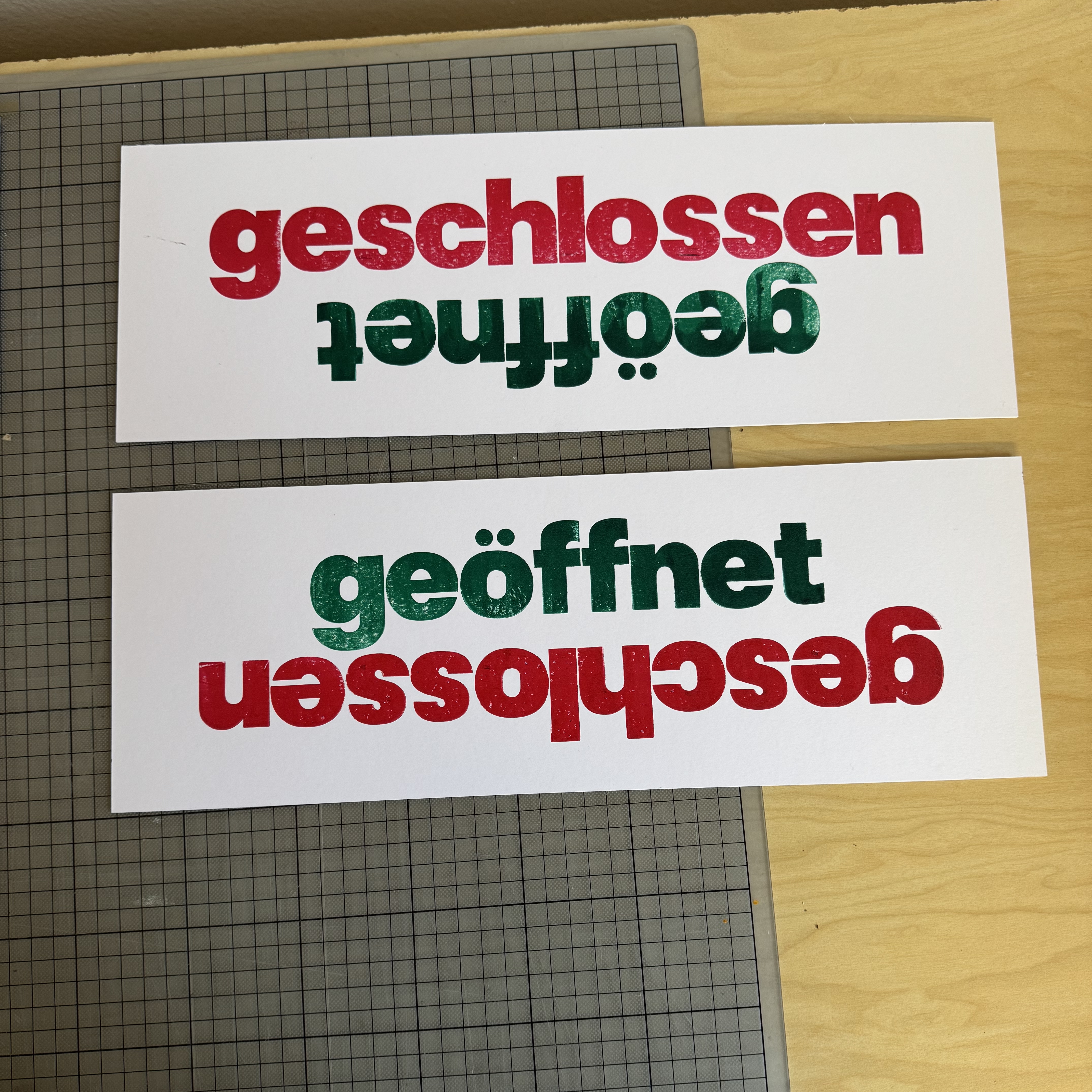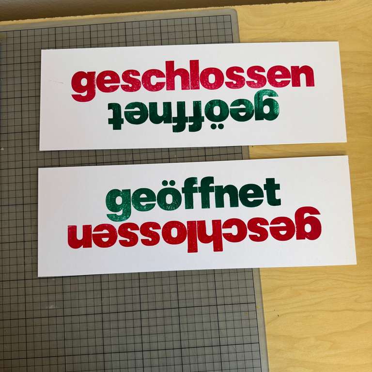 »geöffnet/geschlossen« »Bin gleich zurück« ein Wendeschild nach alter Tradition. Auf weißem Karton mit Lochverstärker ausgerüstet.