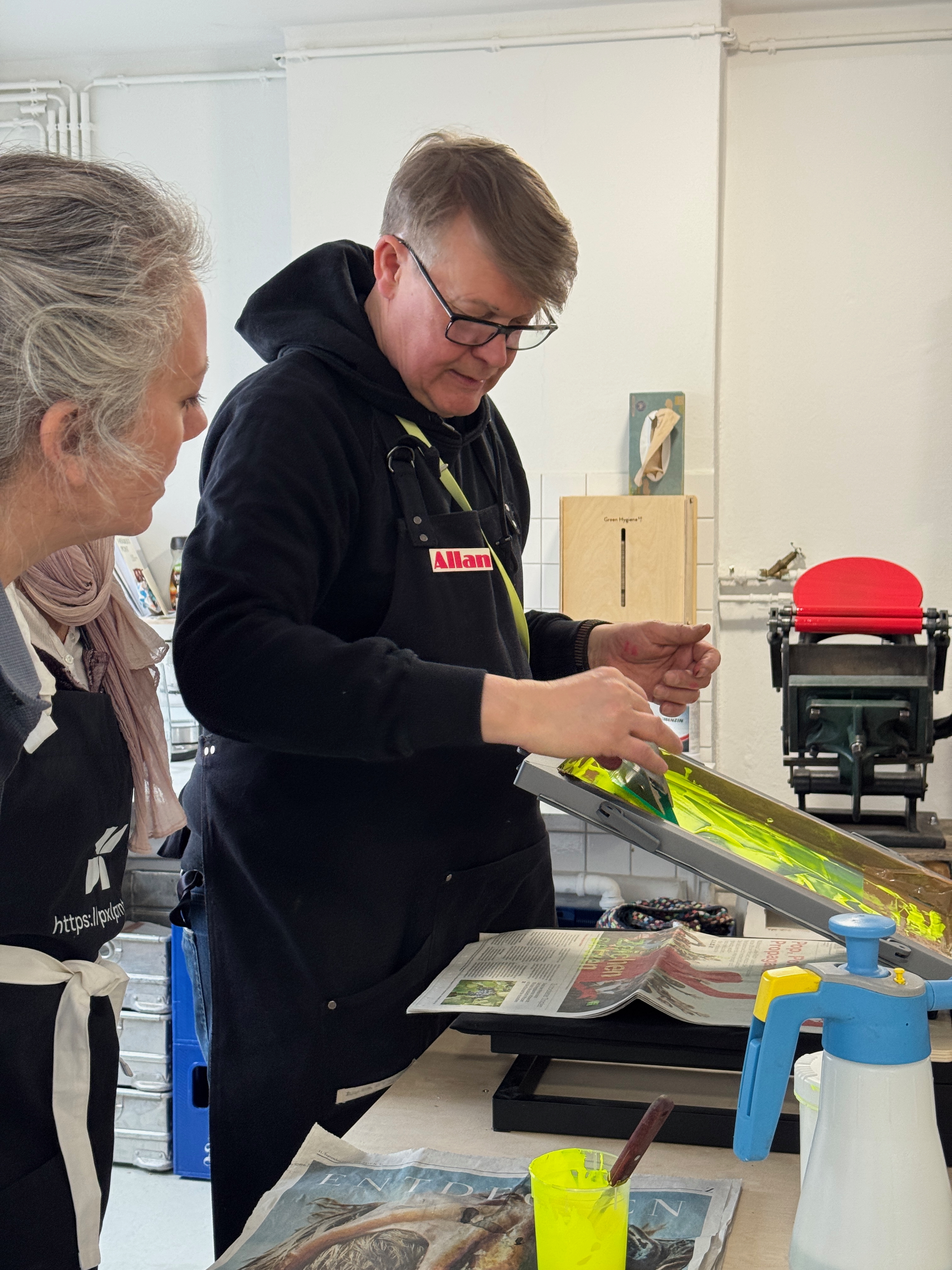Und was lässt sich mit den beim Tag der Druckkunst vorgestellten Schriften und Gerätschaften Weiteres praktisch machen? Vorbereitet für die beiden Werkstatt-Tage sind Stofftaschen, die von den Werkstatt-Besuchern per Siebdruck und dem Einsatz der zuvor vorgestellten Holzlettern bunt bedruckt werden können. Eine interessante, spannende Aktion, die Lust auf mehr macht!