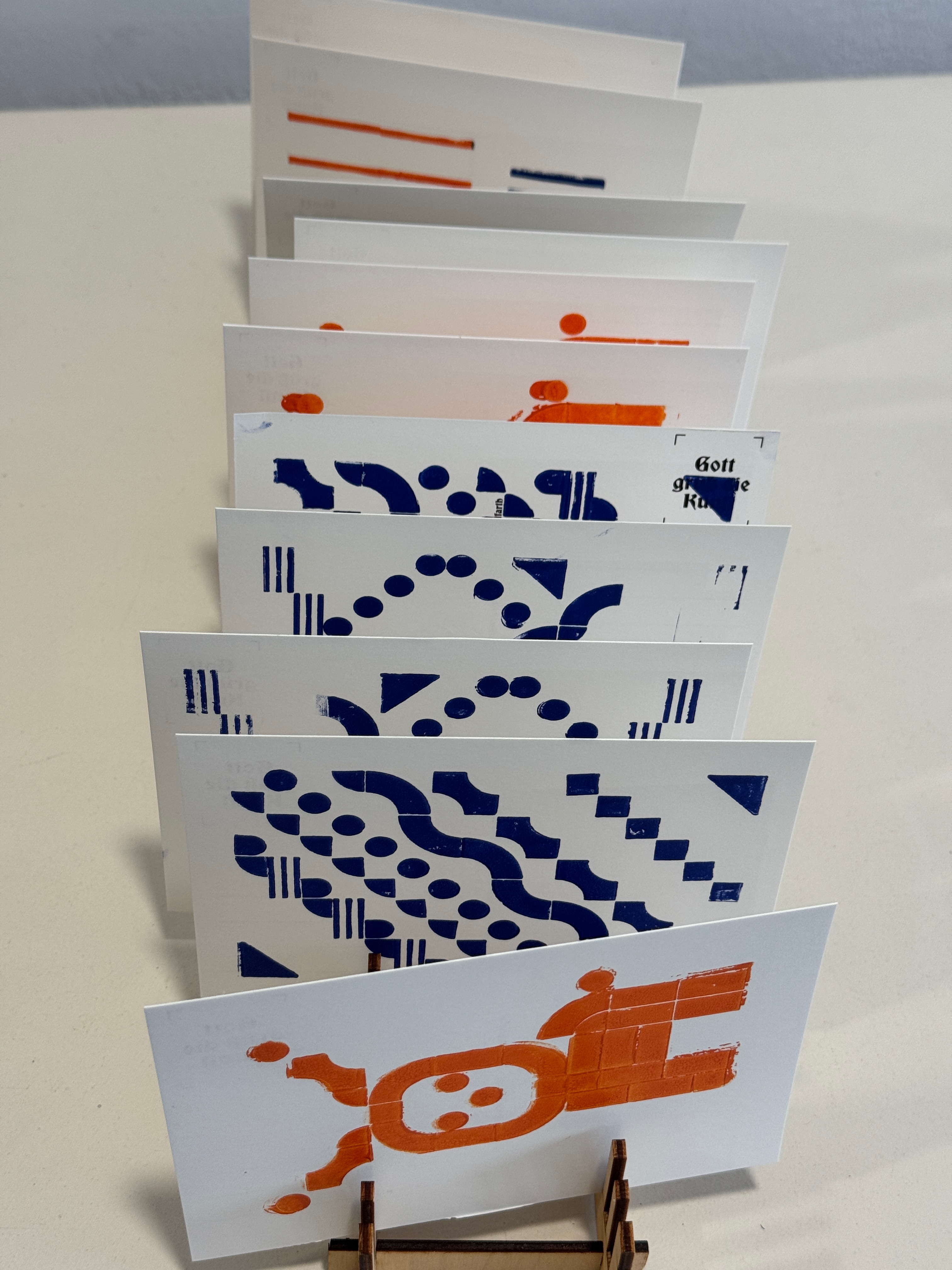 Das Geräusch vom kleinen Buchdruck-Tiegel wird uns stetig begleiten. Jeder kann ein bereits vorbereitetes Postkartenmotiv selber drucken. – Ein fast meditativer Vorgang, der die im 19. Jahrhundert entwickelte Drucktechnik nachvollziehbar und sichtbar macht.